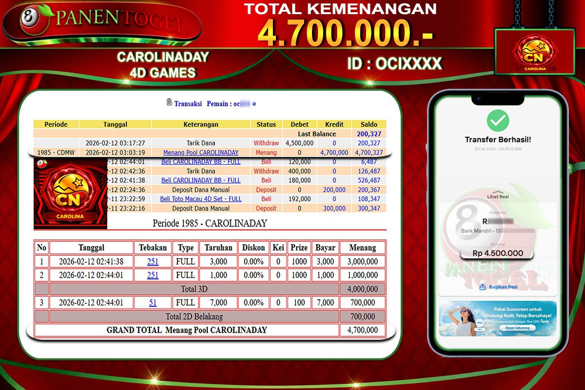 BUKTI KEMENANGAN TOGEL CAROLINADAY PANENTOGEL Rp. 4.700.000, - LUNAS