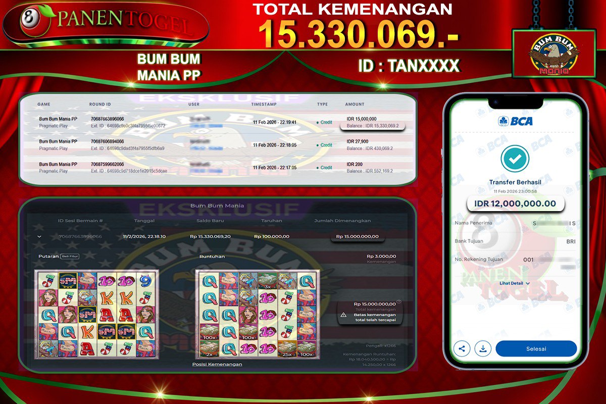 Selamat Kepada User ID : TAN**** Member PANENTOGEL JACKPOT BUM BUM MANIA PP