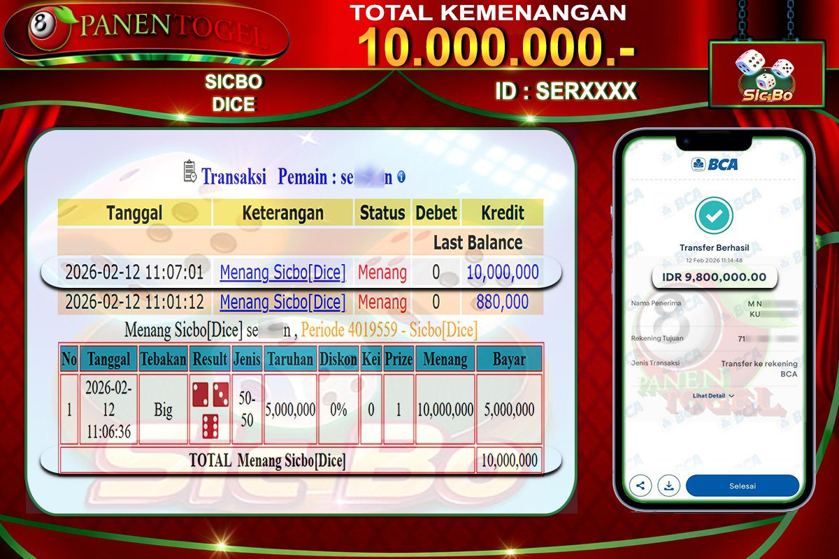 BUKTI KEMENANGAN LIVE GAME SICBO DICE PANENTOGEL Rp. 10.000.000, - LUNAS