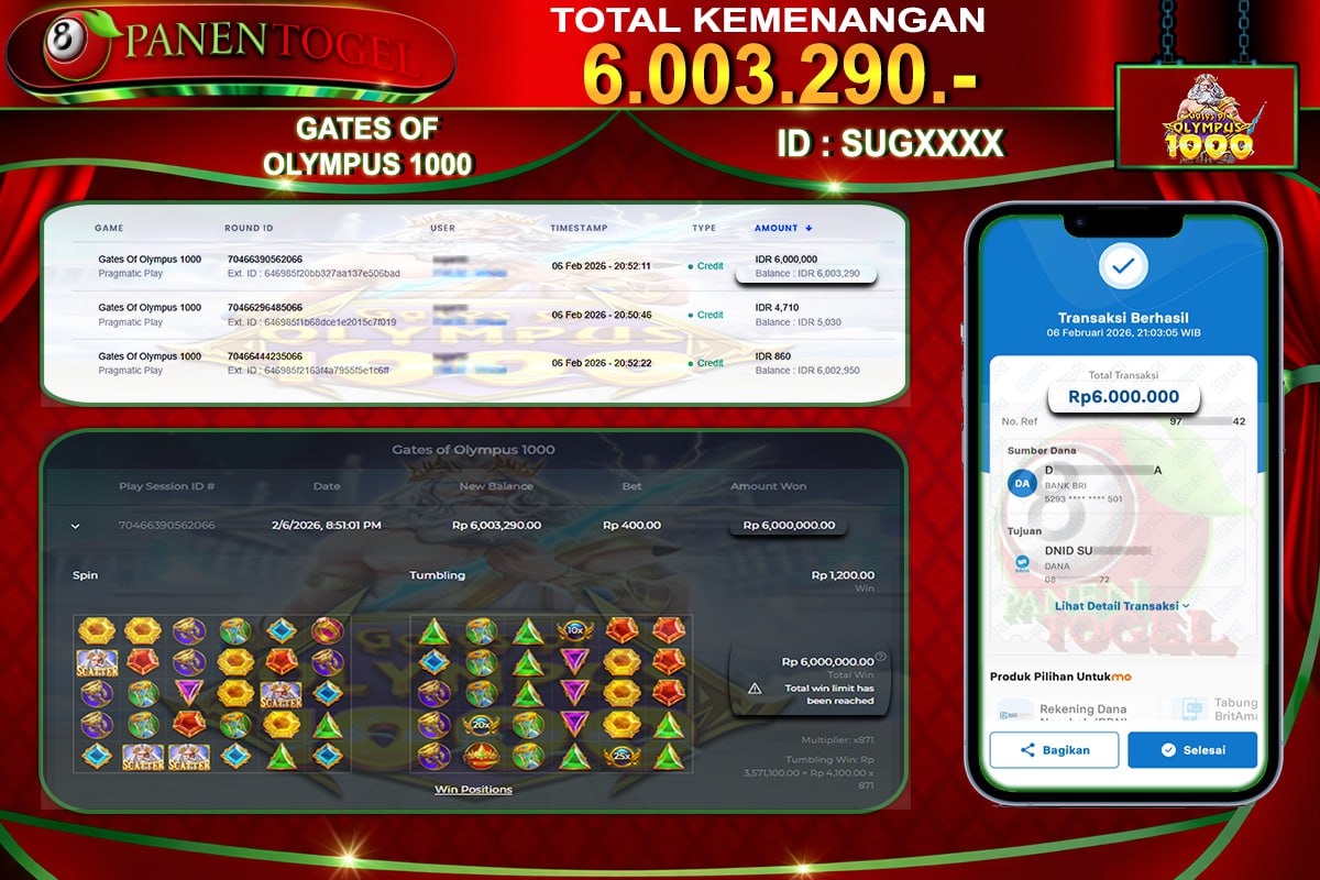 Selamat Kepada User ID : SUG**** Member PANENTOGEL JACKPOT GATE OF OLYMPUS 1000