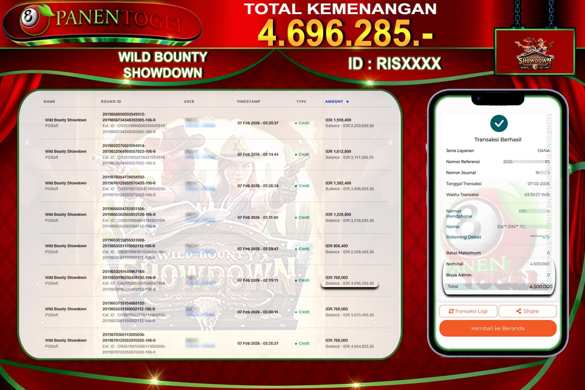 Selamat Kepada User ID : RIS**** Member PANENTOGEL JACKPOT WILD BOUNTY SHOWDOWN