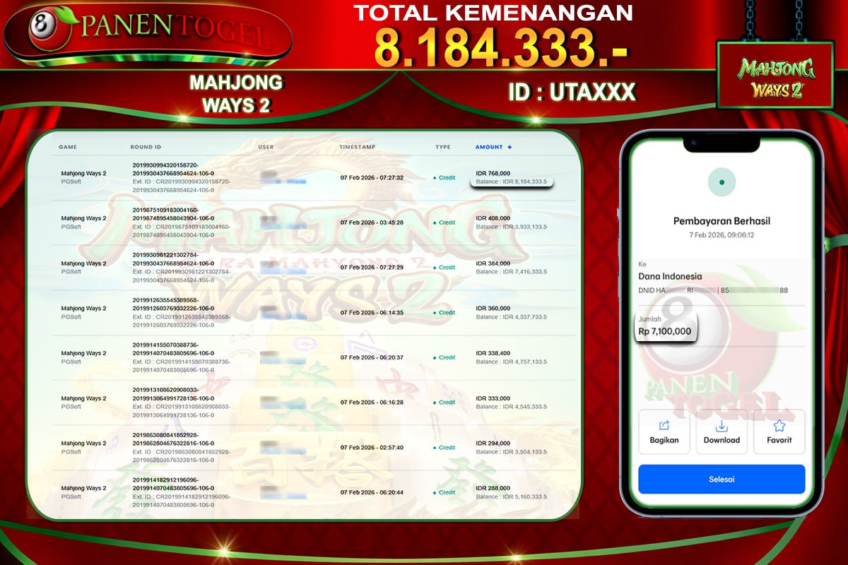 Selamat Kepada User ID : UTA**** Member PANENTOGEL JACKPOT MAHJONG WAYS 2