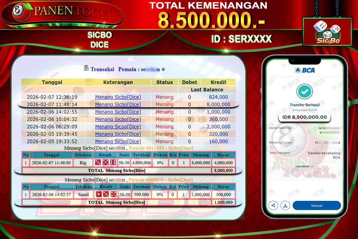 BUKTI KEMENANGAN LIVE GAME SICBO DICE PANENTOGEL Rp. 8.500.000, - LUNAS