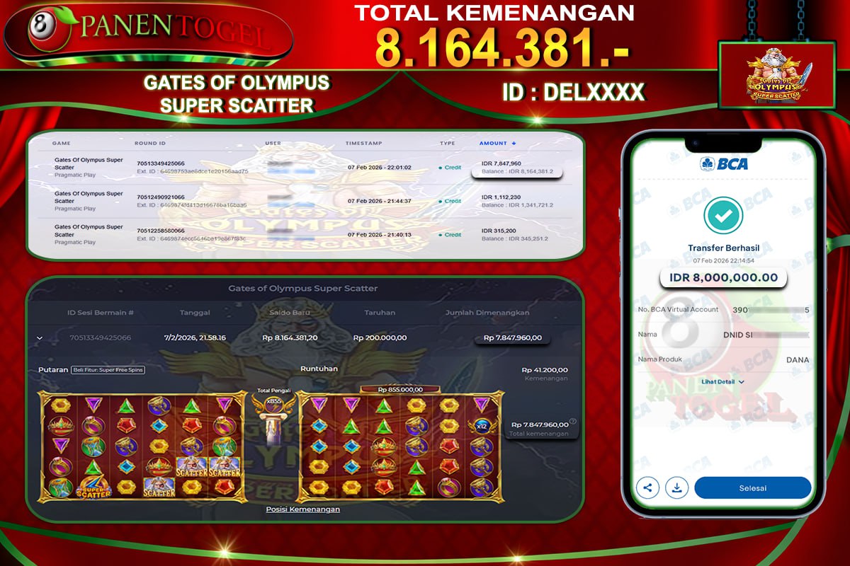 Selamat Kepada User ID : DEL**** Member PANENTOGEL JACKPOT GATES OF OLYMPUS SUPER SCATTER