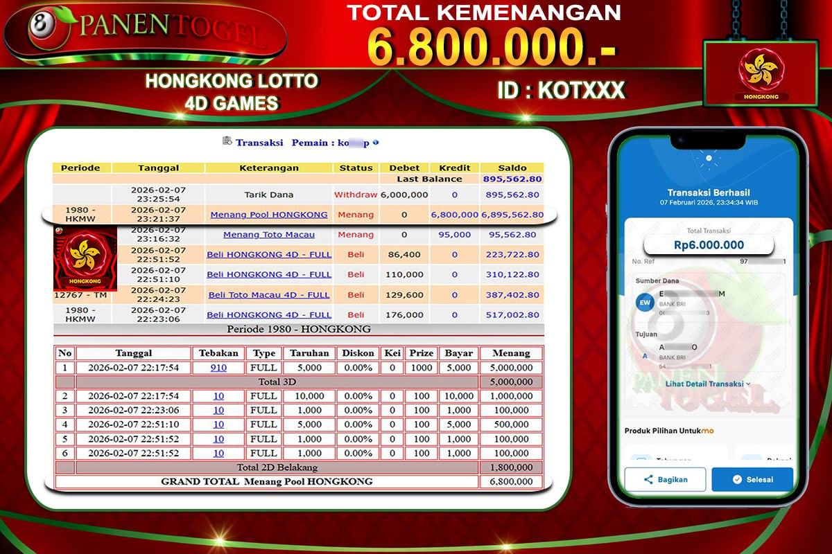 BUKTI KEMENANGAN TOGEL HONGKONG LOTTO 4D PANENTOGEL Rp. 6.800.000, - LUNAS