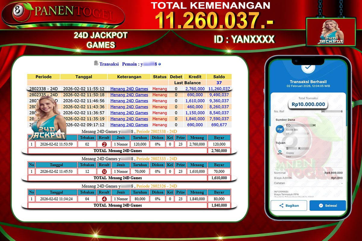 Selamat Kepada User ID : YAN**** Member PANENTOGEL JACKPOT LIVE GAME 24D JACKPOT