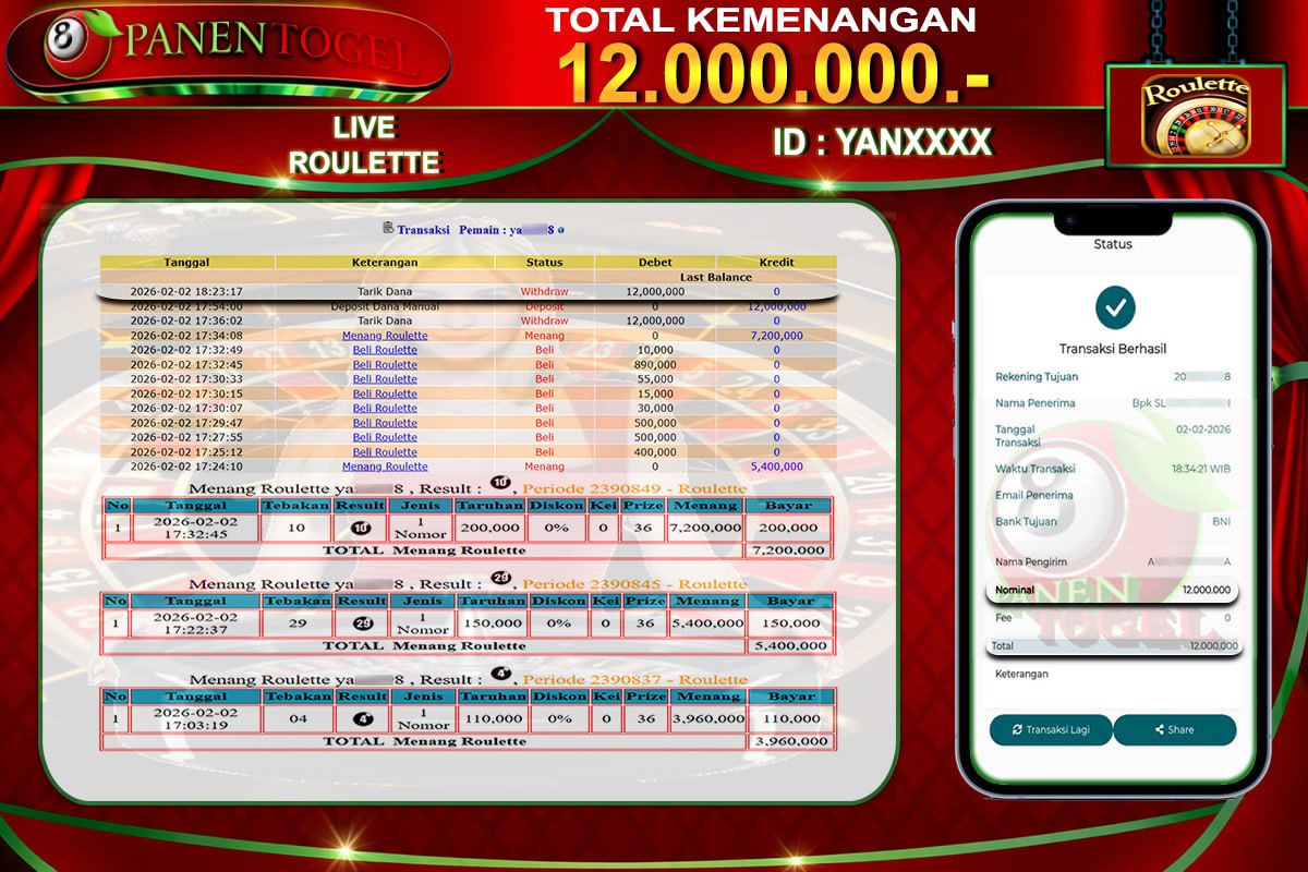 BUKTI KEMENANGAN ROULETTE PANENTOGEL Rp. 12.000.000, - LUNAS