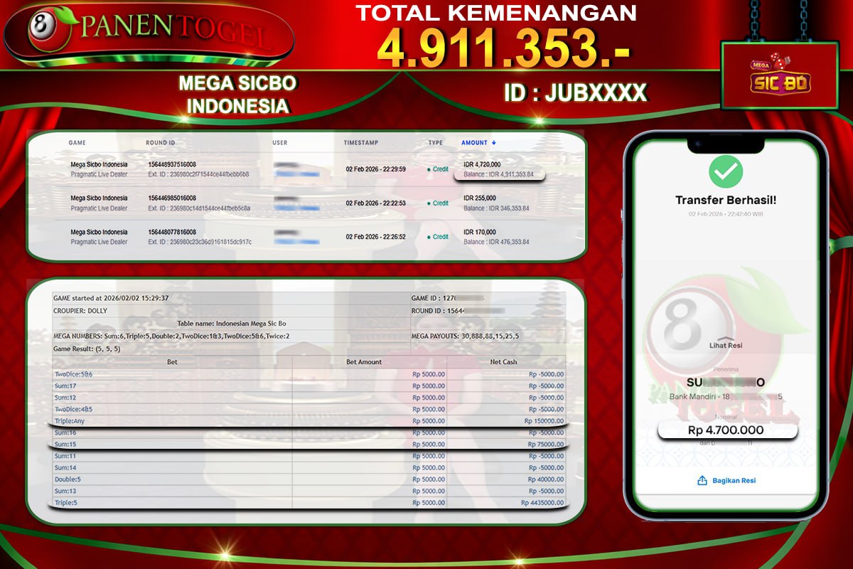 Selamat Kepada User ID : JUB**** Member PANENTOGEL JACKPOT MEGA SICBO INDONESIA