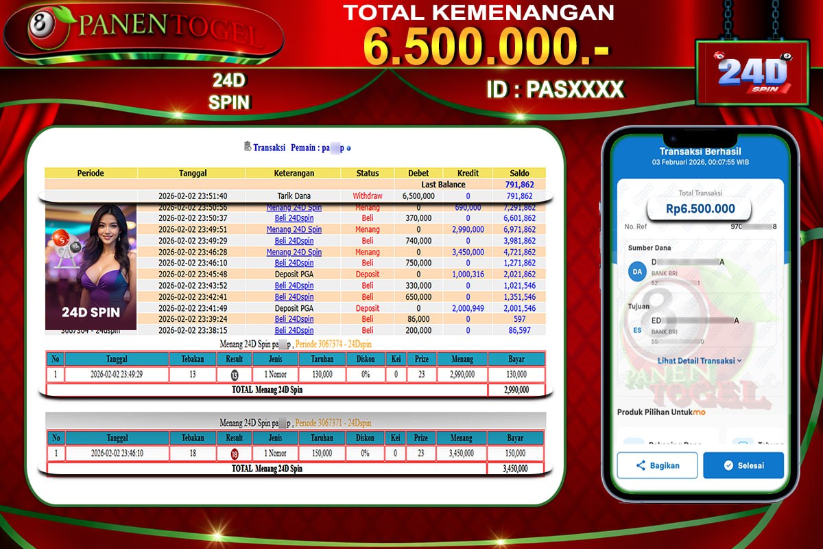 BUKTI KEMENANGAN LIVE GAME 24D SPIN PANENTOGEL Rp. 6.500.000, - LUNAS
