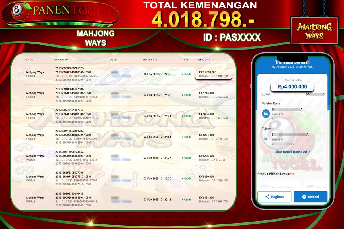 Selamat Kepada User ID : PAS**** Member PANENTOGEL JACKPOT MAHJONG WAYS