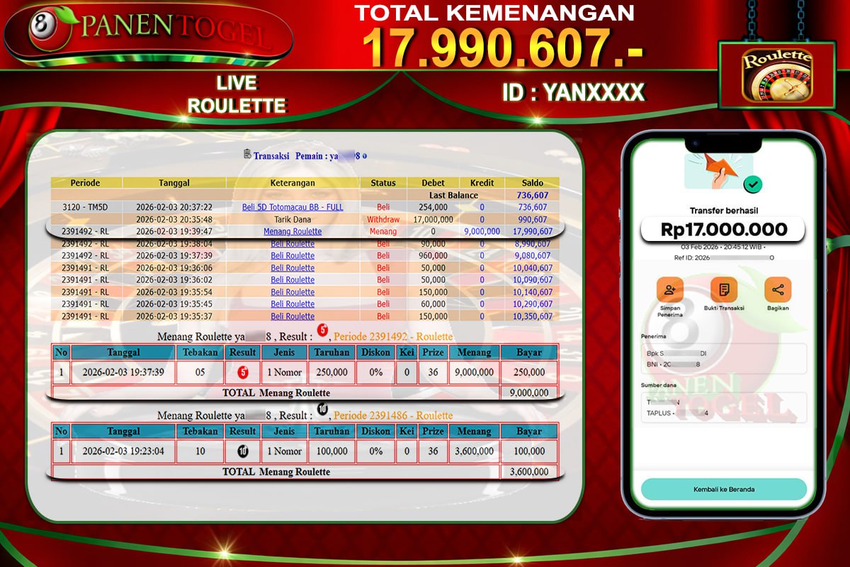 BUKTI KEMENANGAN LIVE GAME ROULETTE PANENTOGEL Rp. 17.990.607, - LUNAS