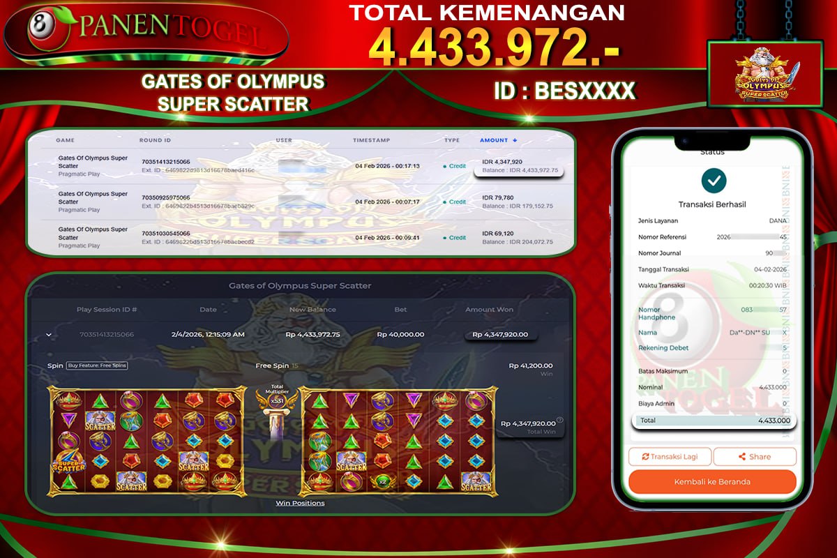 Selamat Kepada User ID : BES**** Member PANENTOGEL JACKPOT GATES OF OLYMPUS SUPER SCATTER