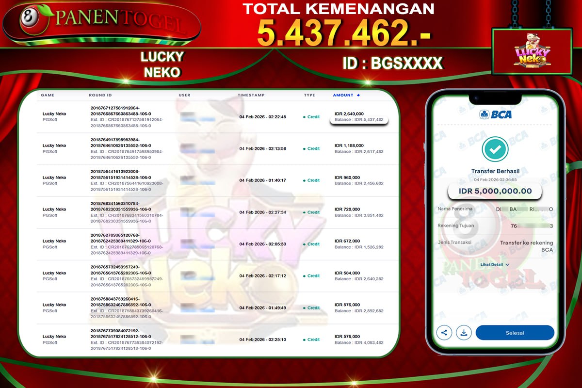 Selamat Kepada User ID : BGS**** Member PANENTOGEL JACKPOT LUCKY NEKO