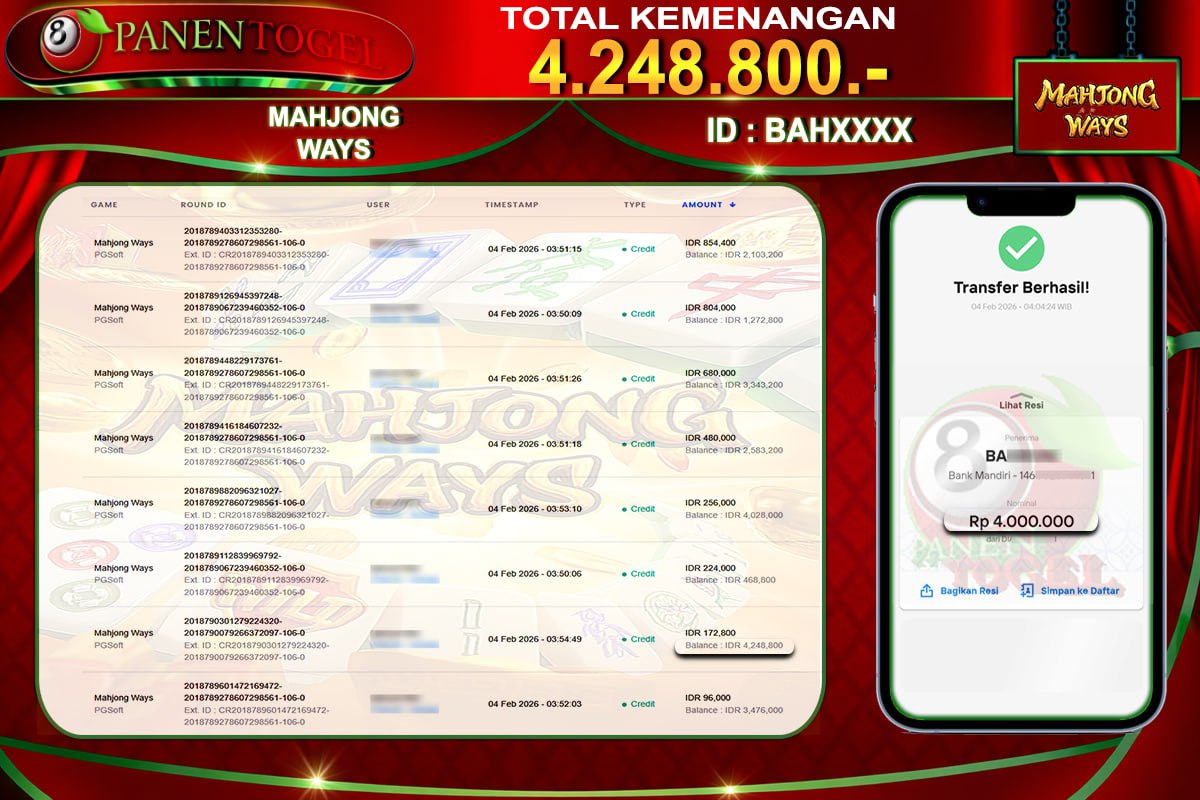 Selamat Kepada User ID : BAH**** Member PANENTOGEL JACKPOT MAHJONG WAYS
