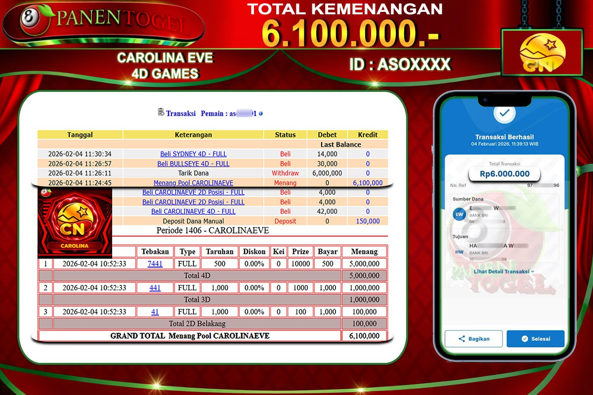 BUKTI KEMENANGAN TOGEL CAROLINA EVENING PANENTOGEL Rp. 6.100.000, - LUNAS