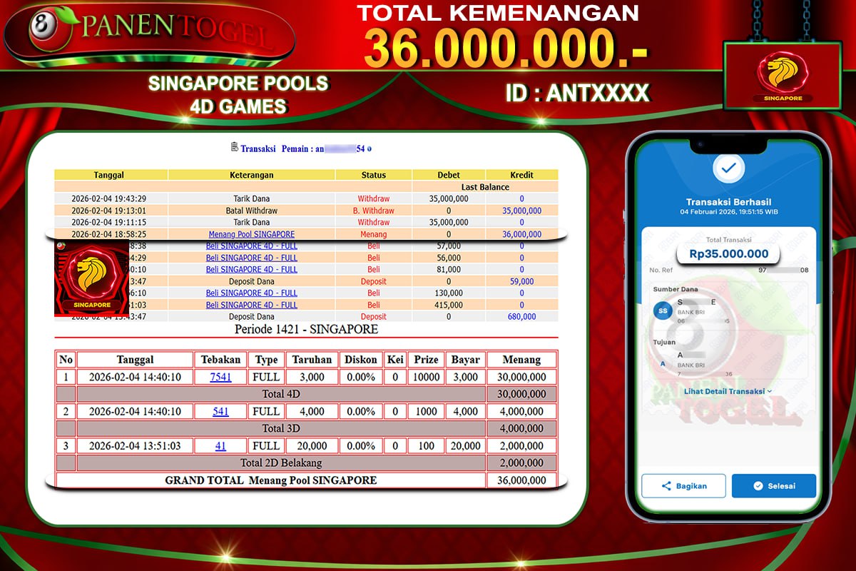 BUKTI KEMENANGAN TOGEL SINGAPORE POOLS PANENTOGEL Rp. 36.000.000, - LUNAS