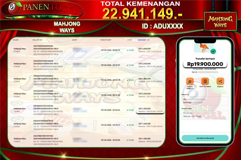 Selamat Kepada User ID : ADU**** Member PANENTOGEL JACKPOT SLOT MAHJONG WAYS
