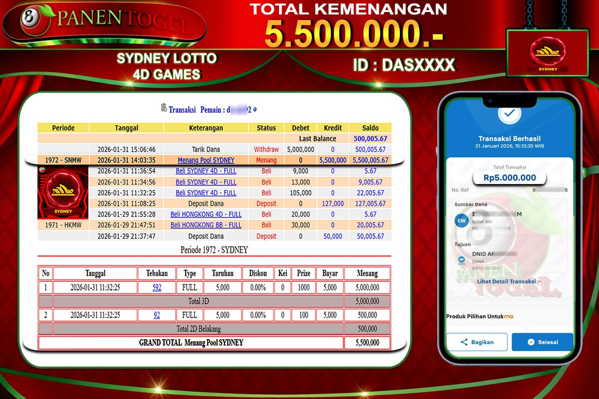 BUKTI KEMENANGAN SYDNEY LOTTO PANENTOGEL Rp. 5.500.000, - LUNAS