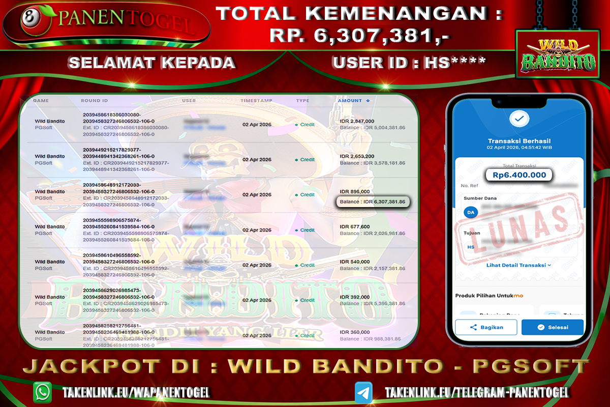 Selamat Kepada User ID : HS**** Member PANENTOGEL JACKPOT WILD BANDITO