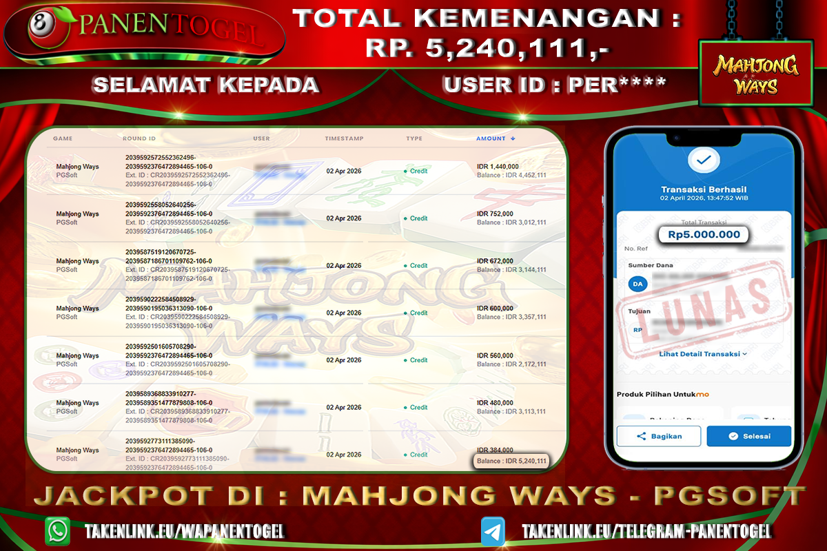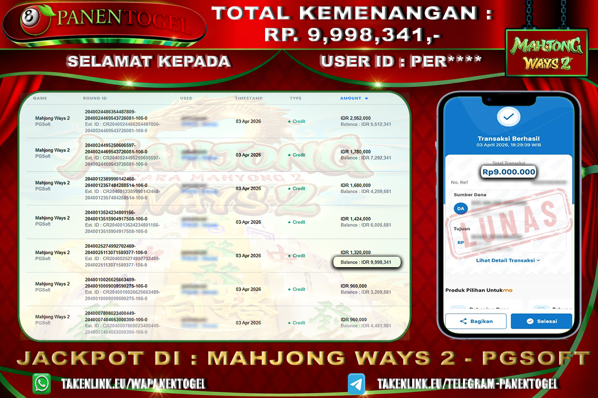 Selamat Kepada User ID : PER**** Member PANENTOGEL JACKPOT MAHJONG WAYS 2