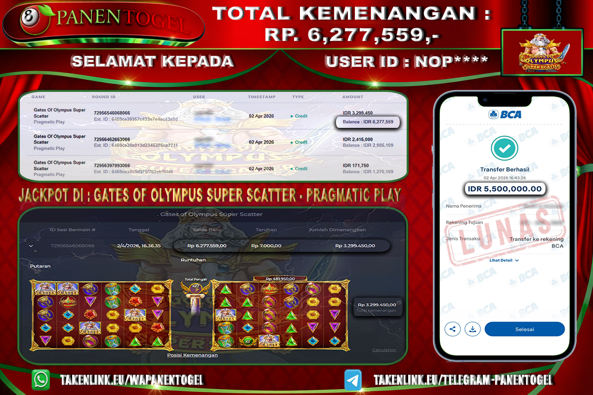 Selamat Kepada User ID : NOP**** Member PANENTOGEL JACKPOT GATES OF OLYMPUS SUPER SCATTER