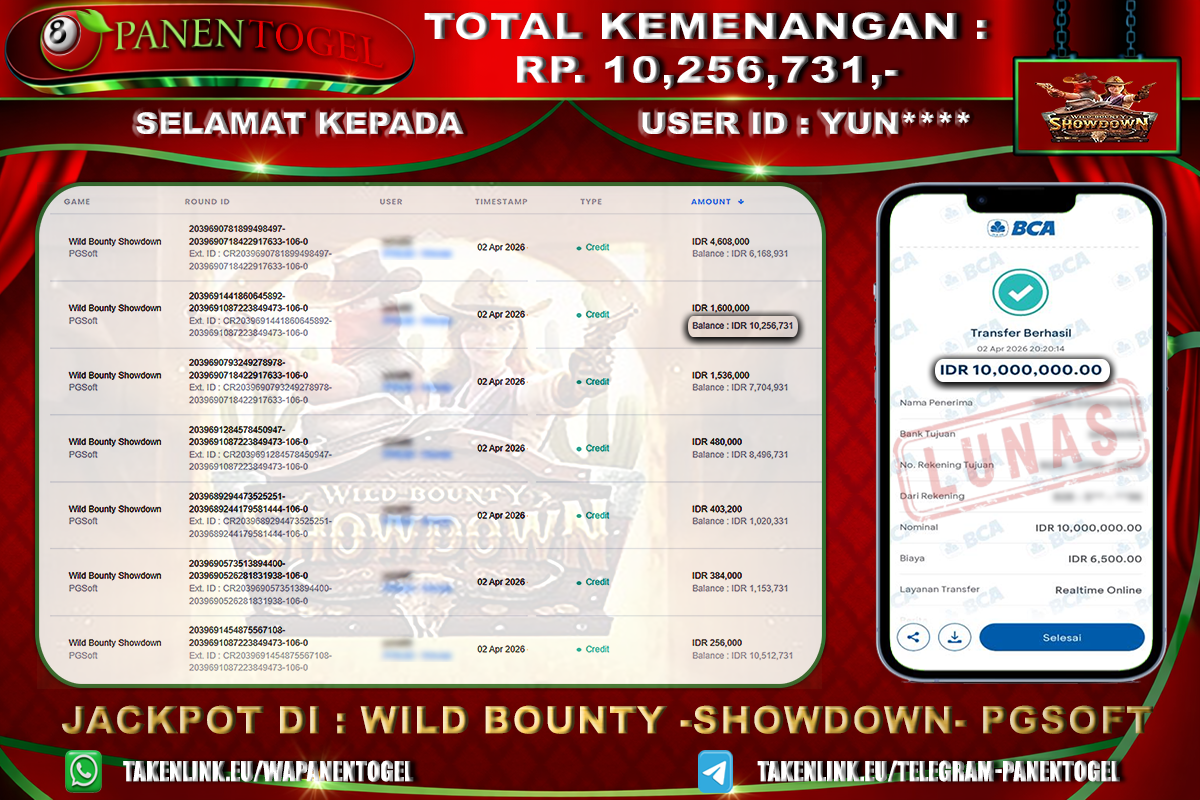 Selamat Kepada User ID : YUN**** Member PANENTOGEL JACKPOT WILD BOUNTY SHOWDOWN