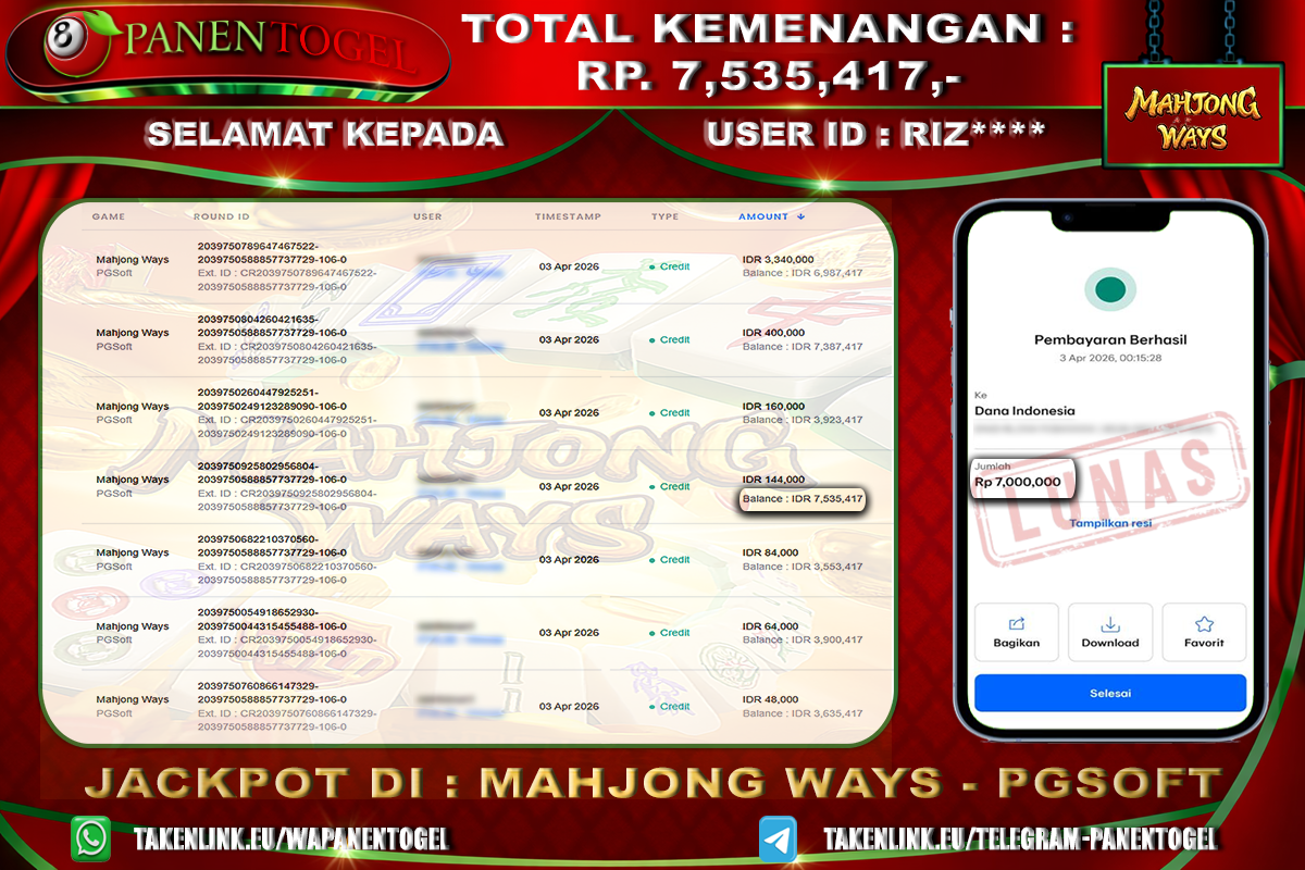 Selamat Kepada User ID : RIZ**** Member PANENTOGEL JACKPOT MAHJONG WAYS