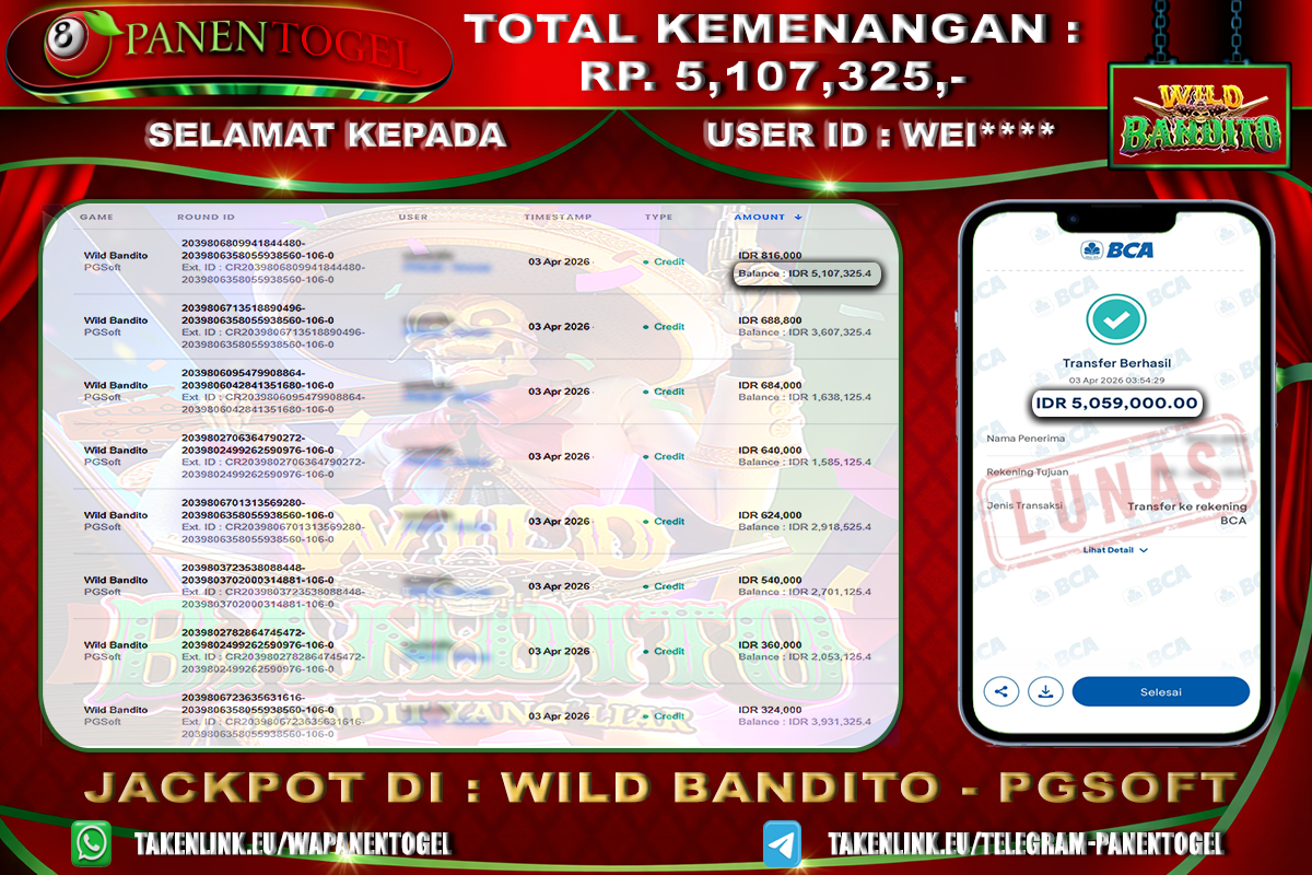 Selamat Kepada User ID : WEI**** Member PANENTOGEL JACKPOT WILD BANDITO