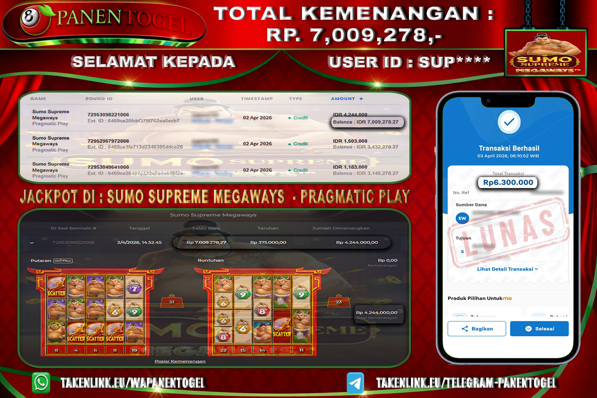 Selamat Kepada User ID : SUP**** Member PANENTOGEL JACKPOT SUMO SUPREME MEGAWAYS