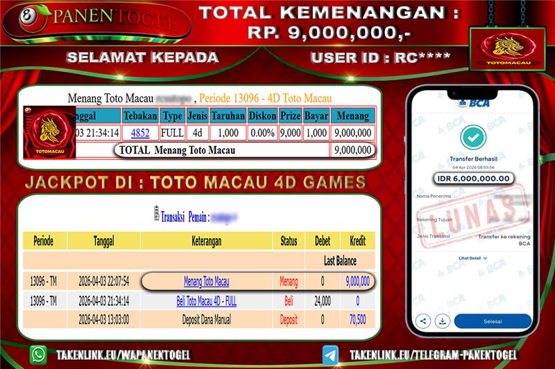 Selamat Kepada User ID : RC**** Member PANENTOGEL JACKPOT TOGEL TOTO MACAU 4D GAMES