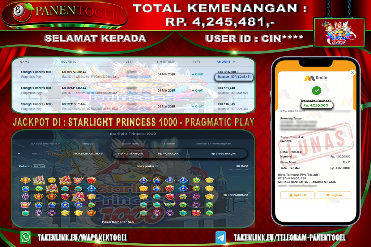 Selamat Kepada User ID : CIN**** Member PANENTOGEL JACKPOT STARLIGHT PRINCESS 1000
