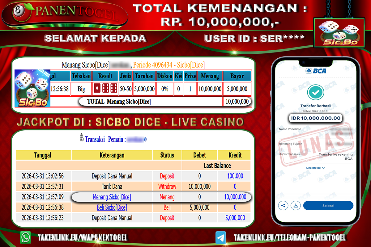 BUKTI KEMENANGAN CASINO SICBO DICE PANENTOGEL Rp. 10.000.000, - LUNAS