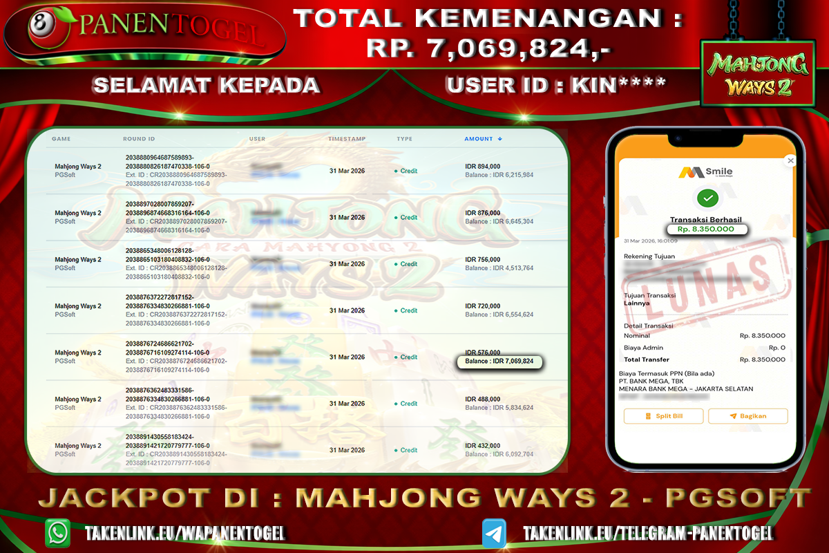 Selamat Kepada User ID : KIN**** Member PANENTOGEL JACKPOT MAHJONG WAYS 2