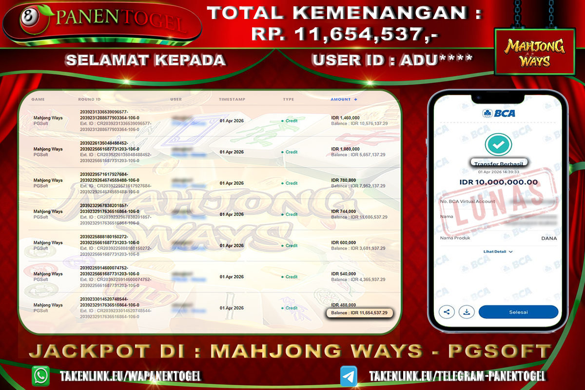 Selamat Kepada User ID : ADU**** Member PANENTOGEL JACKPOT MAHJONG WAYS