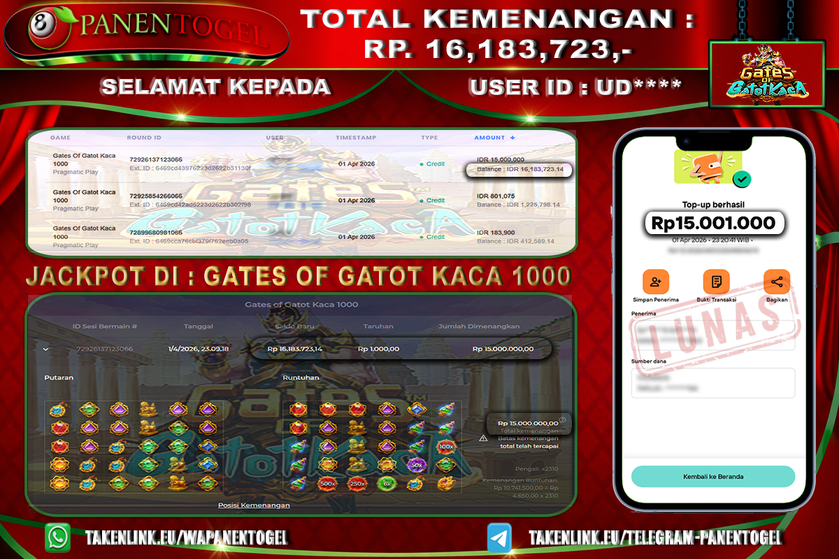 Selamat Kepada User ID : UD**** Member PANENTOGEL JACKPOT GATES OF GATOT KACA 1000