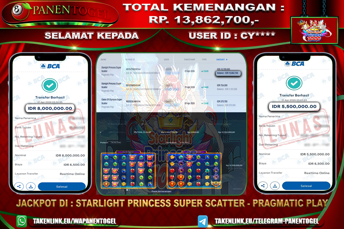 Selamat Kepada User ID : CY**** Member PANENTOGEL JACKPOT STARLIGHT PRINCESS SUPER SCATTER