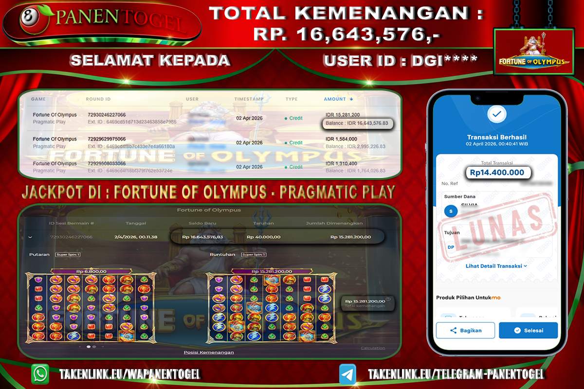 Selamat Kepada User ID : DGI**** Member PANENTOGEL JACKPOT FOTUNE OF OLYMPUS