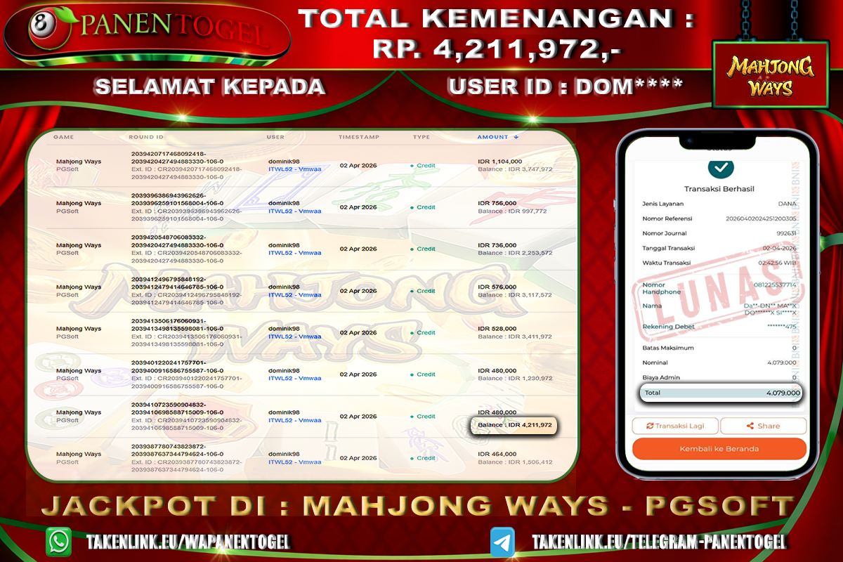 BUKTI KEMENANGAN SLOT PANENTOGEL Rp. 4.211.972, - LUNAS