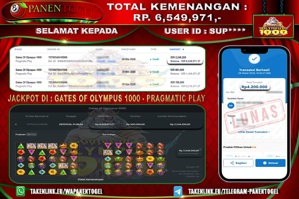 BUKTI KEMENANGAN SLOT PANENTOGEL Rp. 6.549.971, - LUNAS