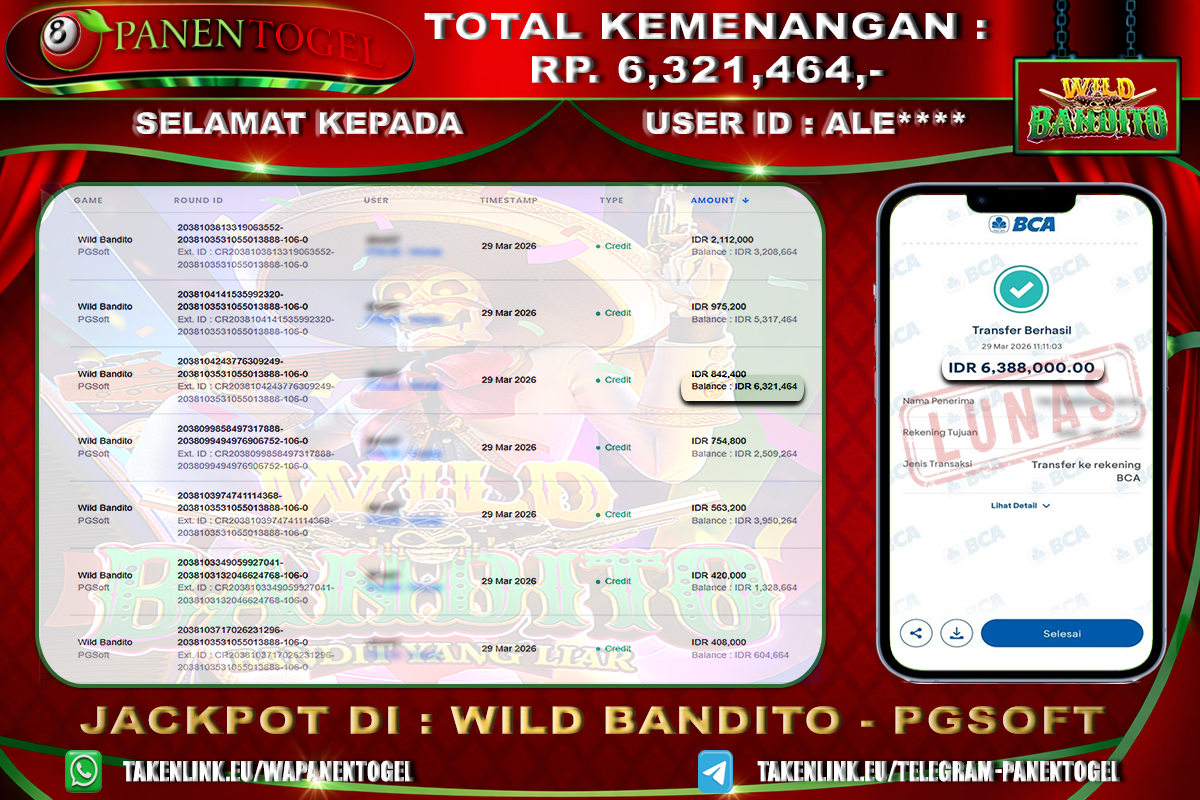 Selamat Kepada User ID : ALE**** Member PANENTOGEL JACKPOT WILD BANDITO