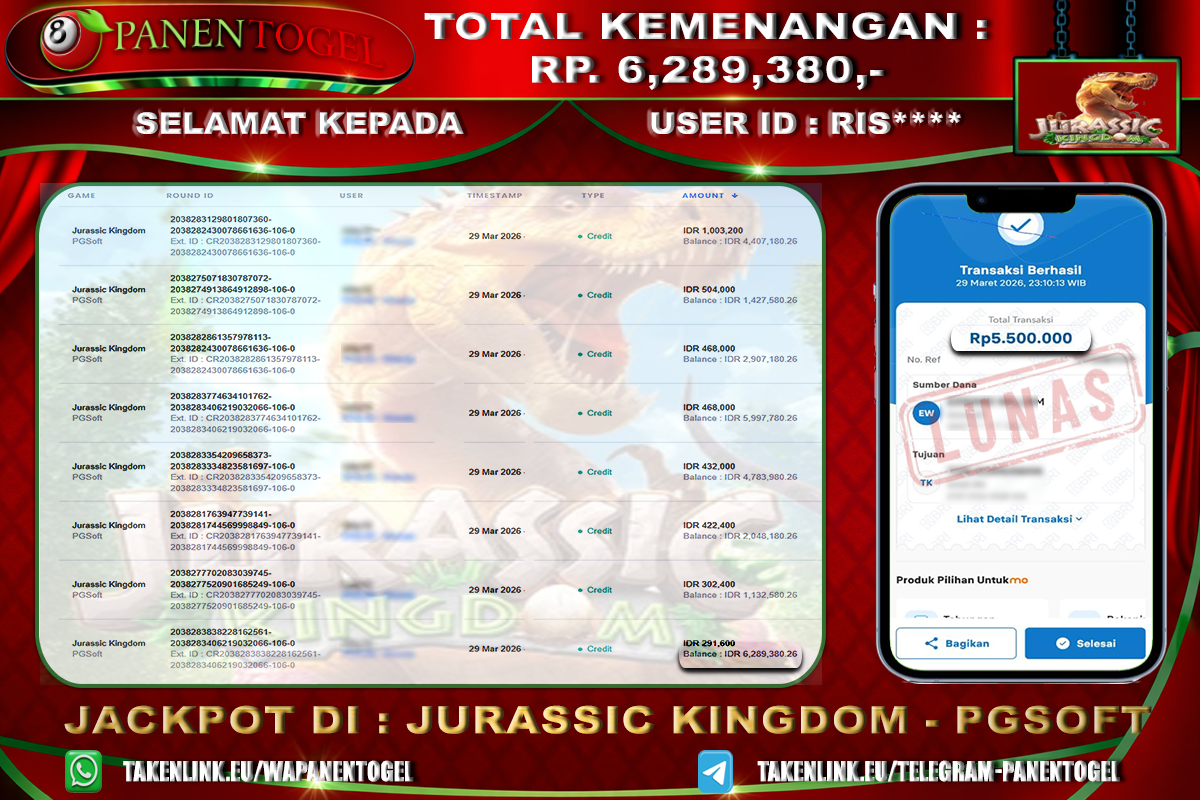 Selamat Kepada User ID : RIS**** Member PANENTOGEL JACKPOT JURASSIC KINGDOM