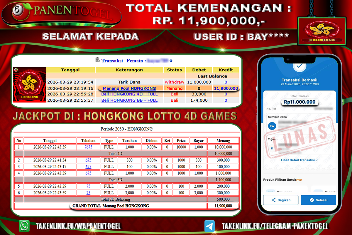 BUKTI KEMENANGAN TOGEL HONGKONG LOTTO 4D GAMES PANENTOGEL Rp. 11.900.000, - LUNAS