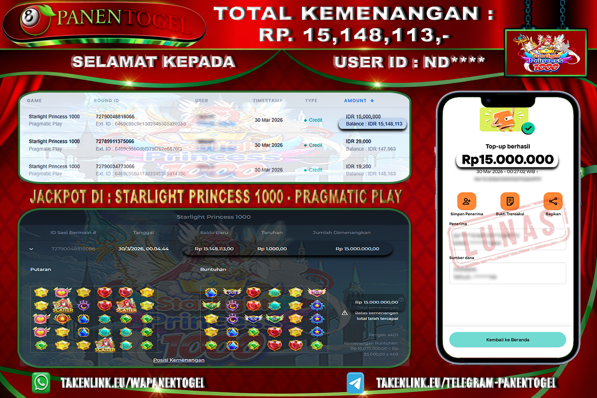 Selamat Kepada User ID : ND**** Member PANENTOGEL JACKPOT STARLIGHT PRINCESS 1000