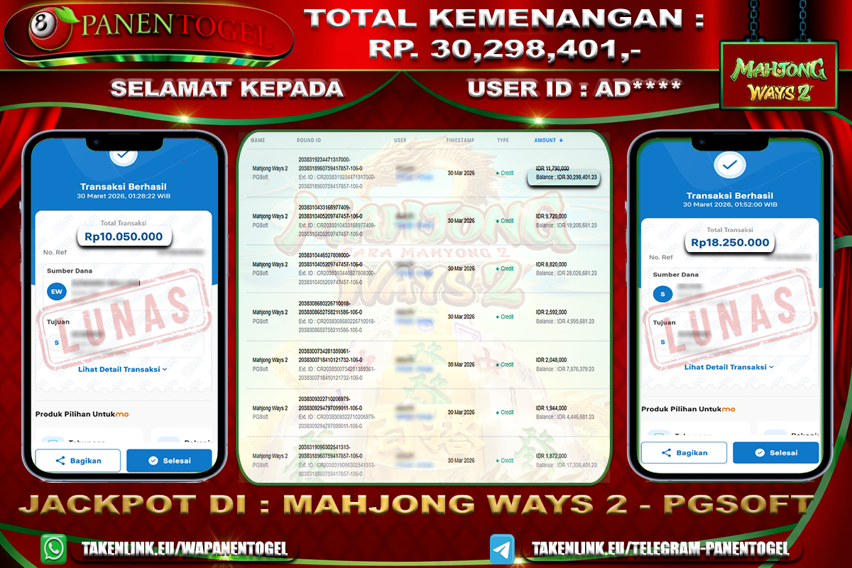 Selamat Kepada User ID : AD**** Member PANENTOGEL JACKPOT MAHJONG WAYS 2