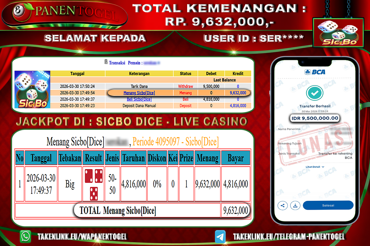 BUKTI KEMENANGAN CASINO SICBO DICE PANENTOGEL Rp. 9.632.000, - LUNAS