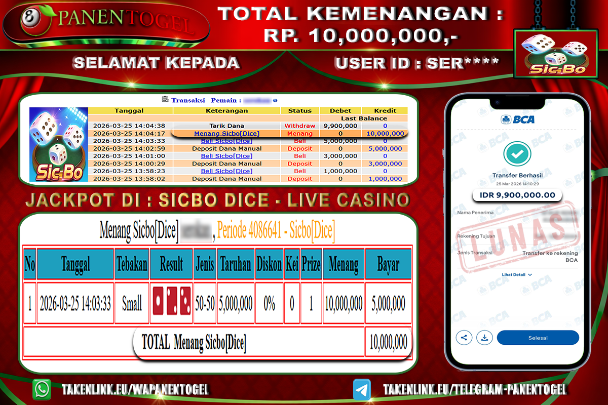 BUKTI KEMENANGAN CASINO SICBO DICE PANENTOGEL Rp. 10.000.000, - LUNAS