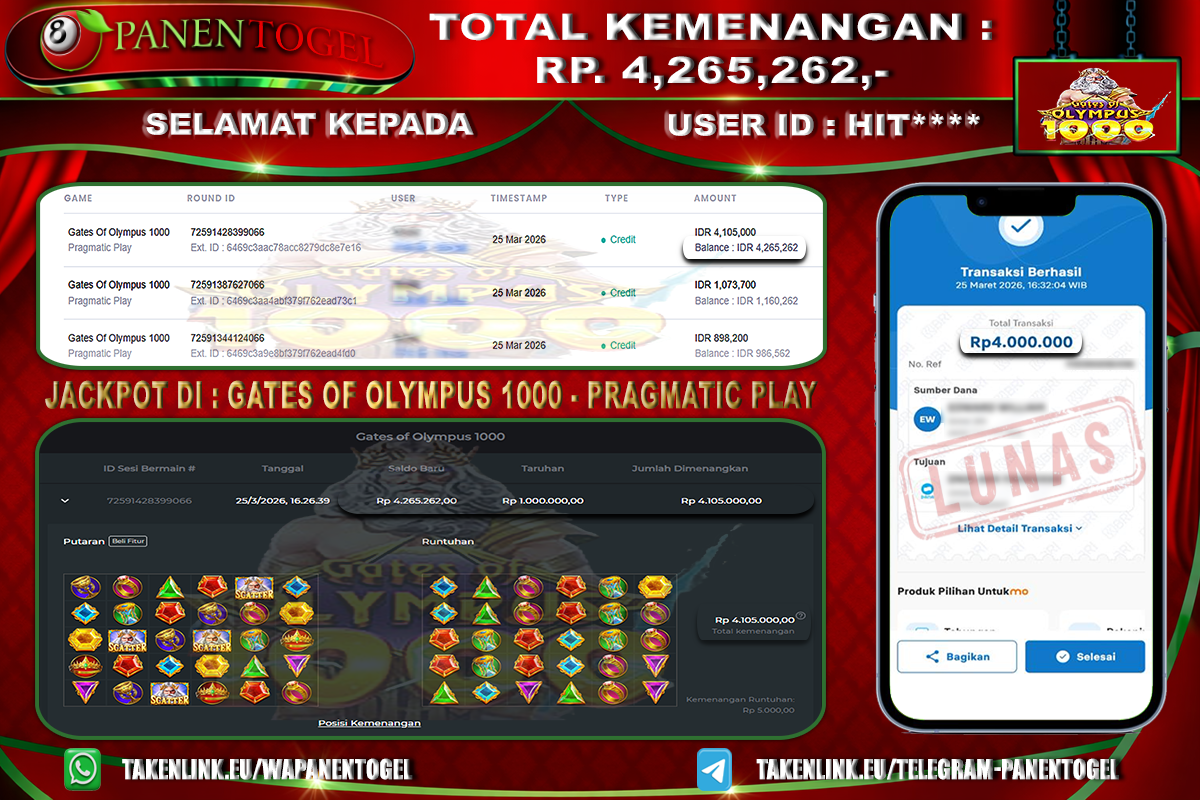 Selamat Kepada User ID : HIT**** Member PANENTOGEL JACKPOT GATES OF OLYMPUS 1000