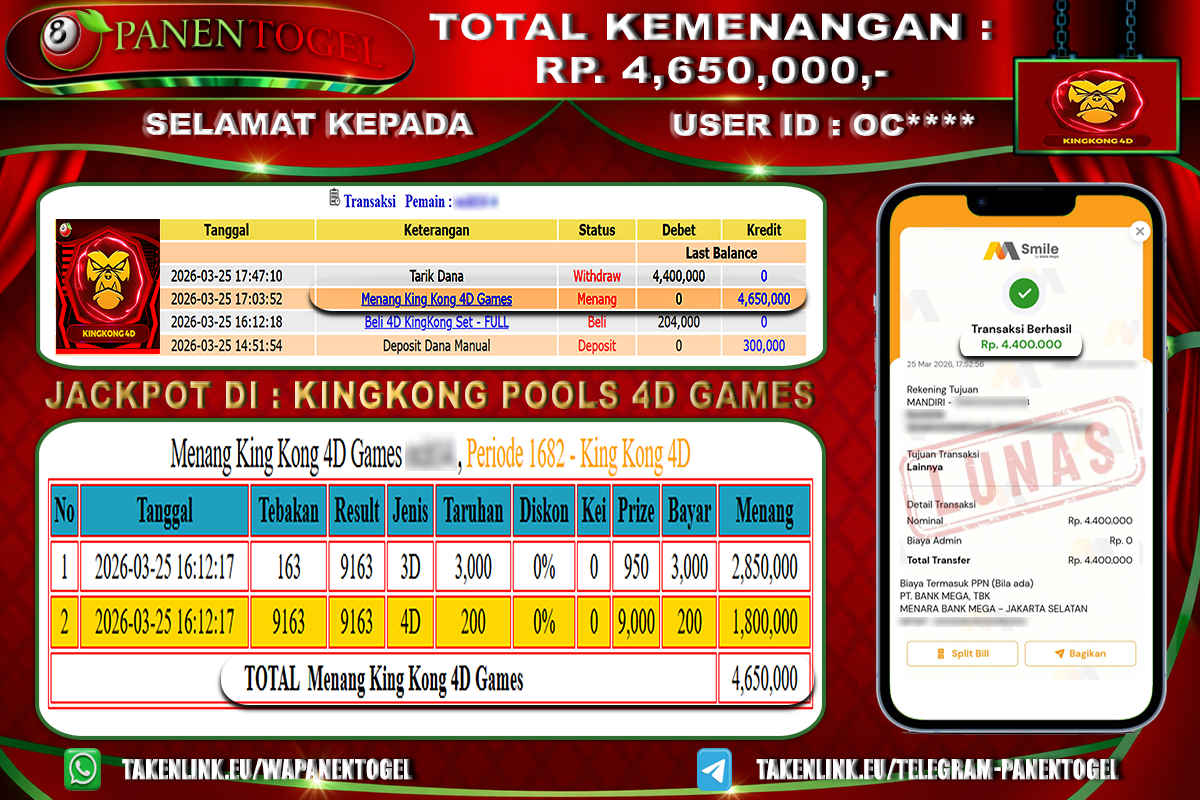 BUKTI KEMENANGAN TOGEL KING KONG 4D GAMES PANENTOGEL Rp. 4.650.000, - LUNAS