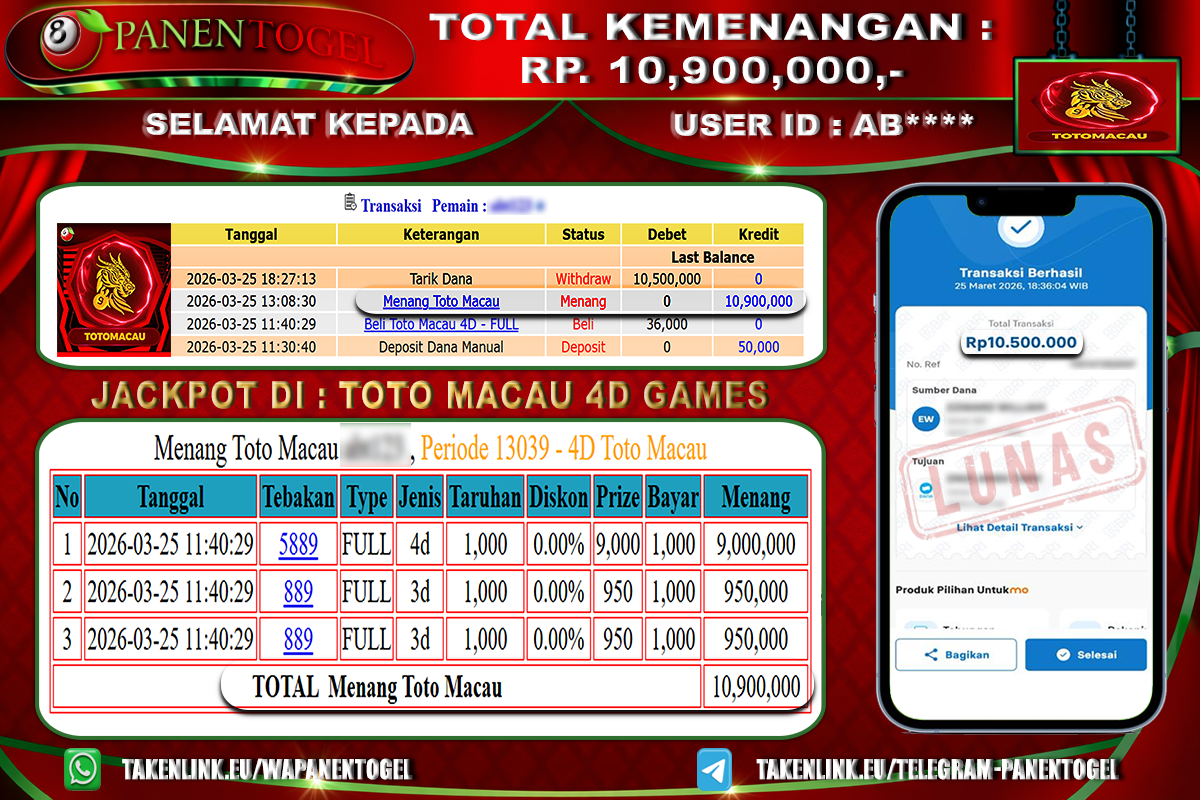 Selamat Kepada User ID : AB**** Member PANENTOGEL JACKPOT TOGEL TOTO MACAU 4D GAMES