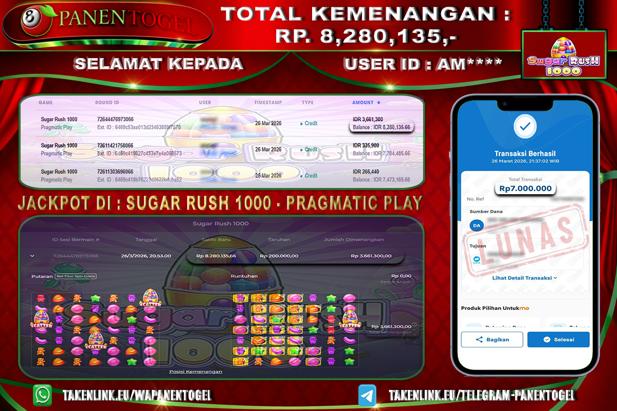 Selamat Kepada User ID : AM**** Member PANENTOGEL JACKPOT SUGAR RUSH 1000
